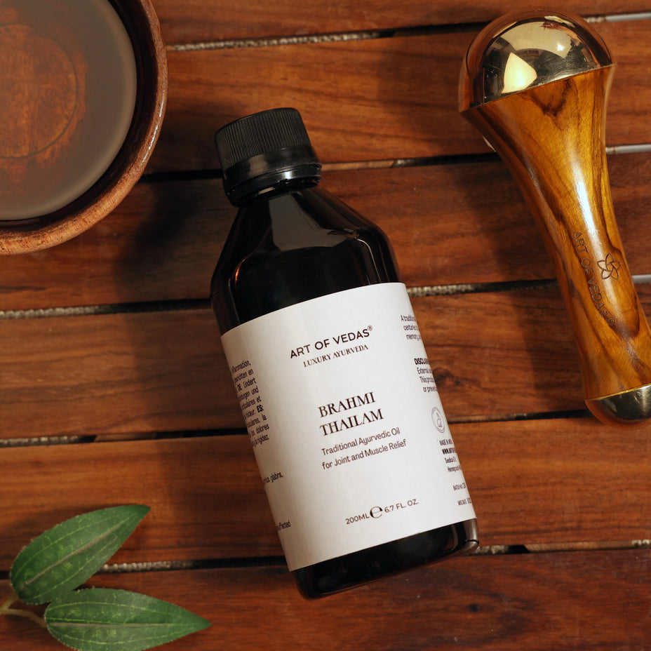 Classical medhya, pitta-pacifying head oil prepared by the traditional taila-pāka method—Brahmi (Bacopa monnieri) processed in an oil base with supportive cooling herbs. Used in Kerala practice to soothe the head–neck region, calm the mind, support sound sleep, and keep the scalp and hair nourished.